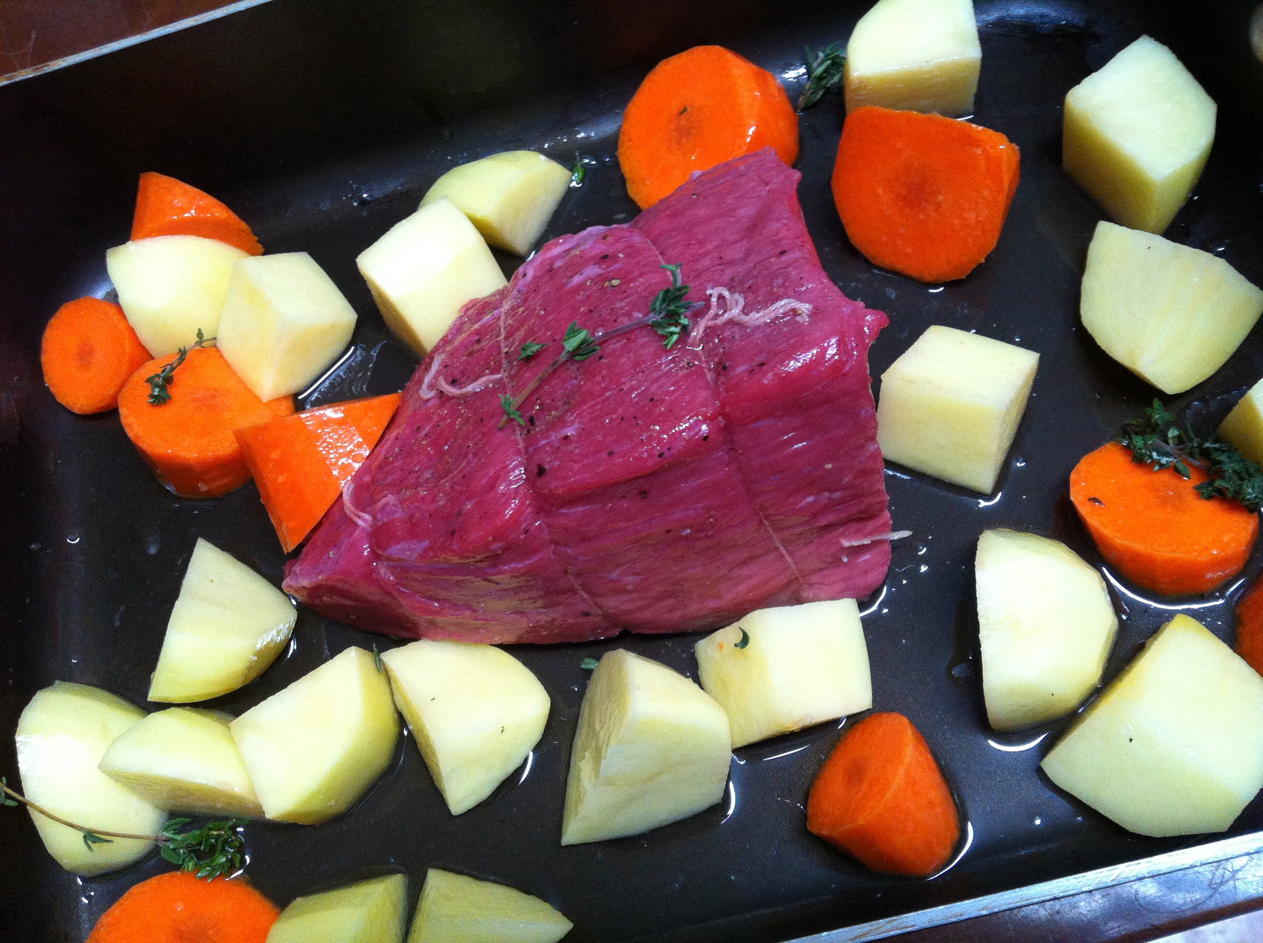 I turned my dish into a bit of a Sunday Roast by throwing in some potatoes and carrot to roast alongside the beef. I also added a few sprigs of thyme as well (I can’t help myself, I have to play around with the recipes….!)