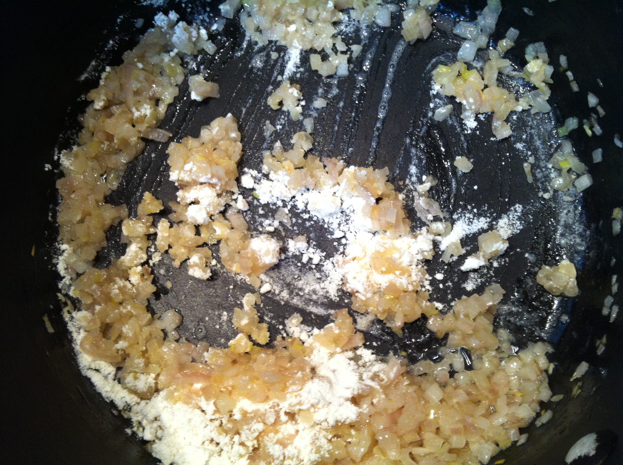 While the beef is cooking, finely dice your shallots and fry them off in some oil being careful not to let them brown. When the shallots are soft, sprinkle over the flour and stir it in before adding the white wine, stirring again, and then adding the stock.