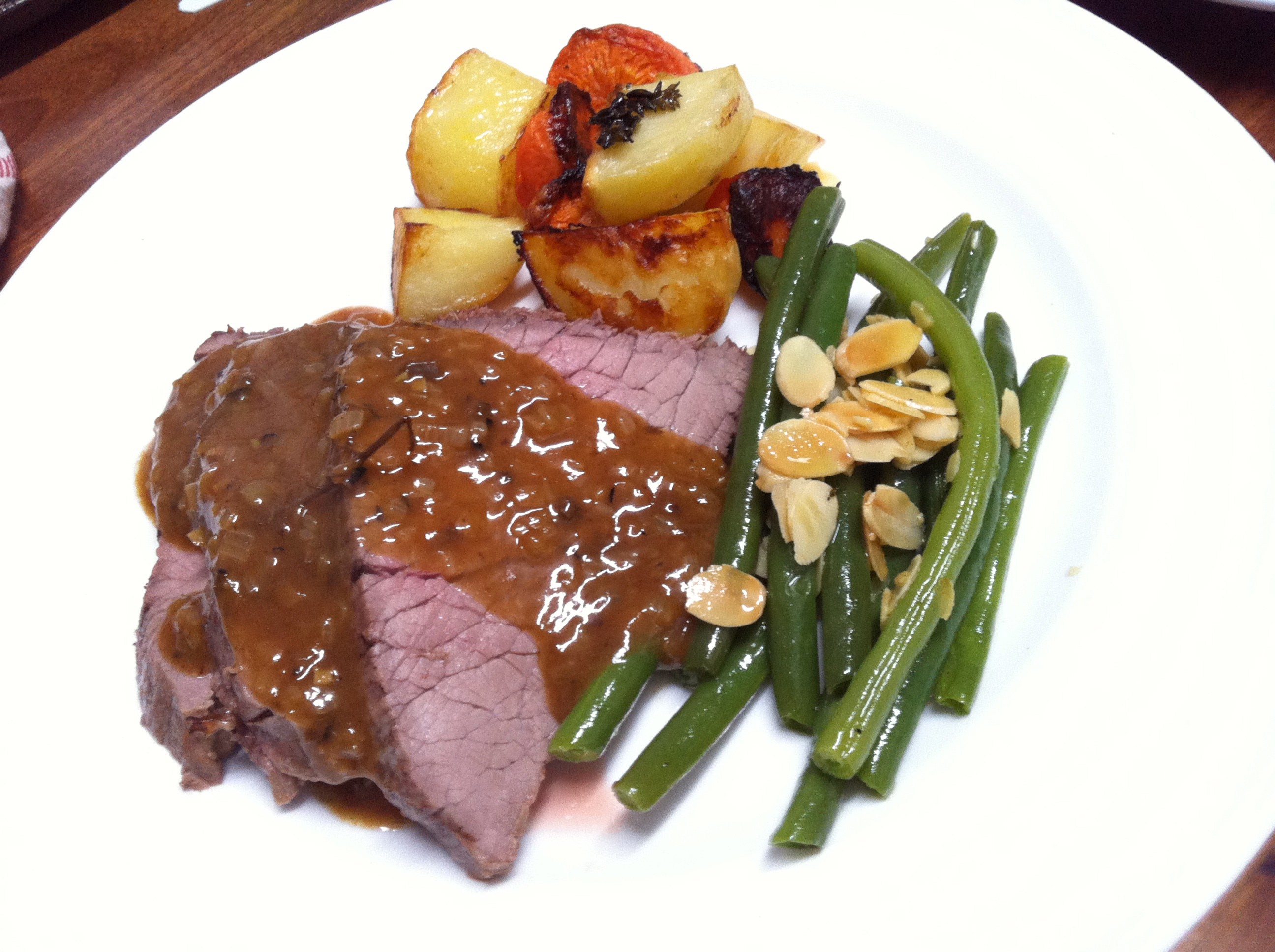 Place the beef in the oven and cook for 25 minutes or until cooked to your liking. I know beef needs to be quite pink, but that simply was not going to fly in my household so I took it a bit further than the 25 minutes the recipe required.