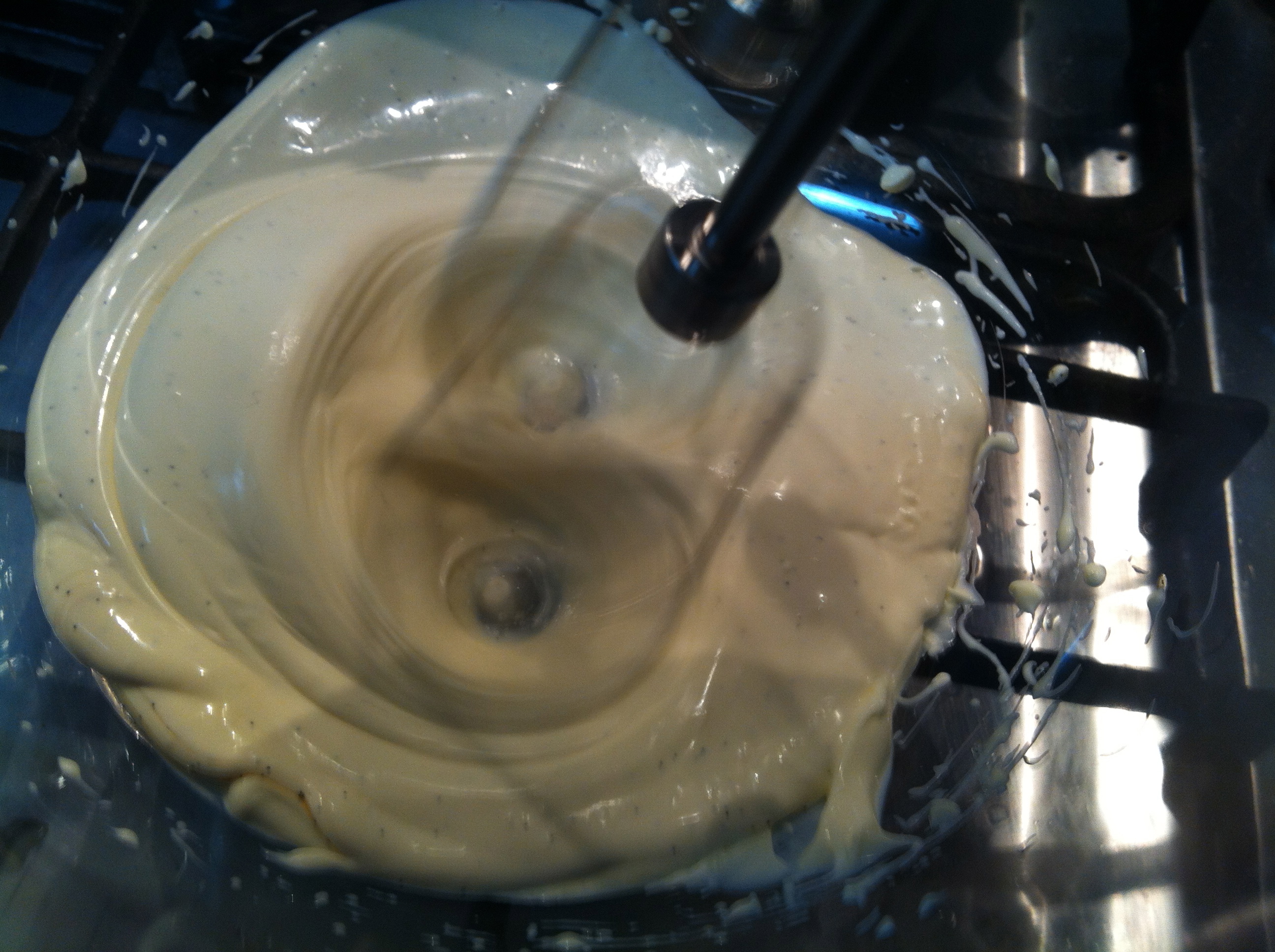 Using a stand mixer or electric beater, whip your egg whites with the salt until thick, then add your sugar (I actually only used 1 tablespoon, preferring a sharper taste to my chocolate) and whip until stiff, shiny peaks form.