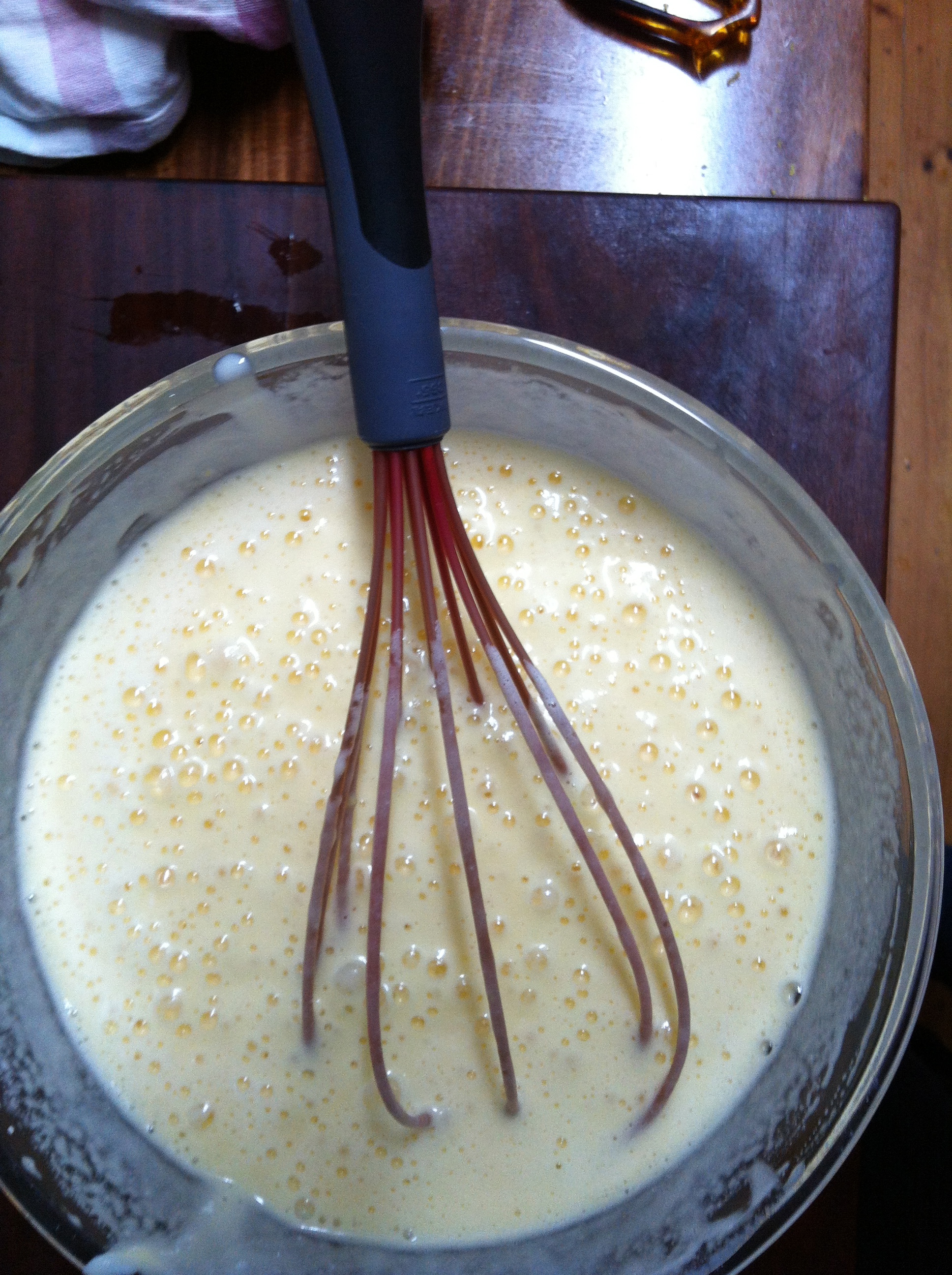 Using a hand whisk, gently add 1/3 of the ricotta mixture to the eggs and whisk to combine. Repeat until all the ricotta is combined with the eggs. You don’t have to fuss with it too much, just be gentle and try not to over whisk. The end result should look thick, creamy and luscious, like this…