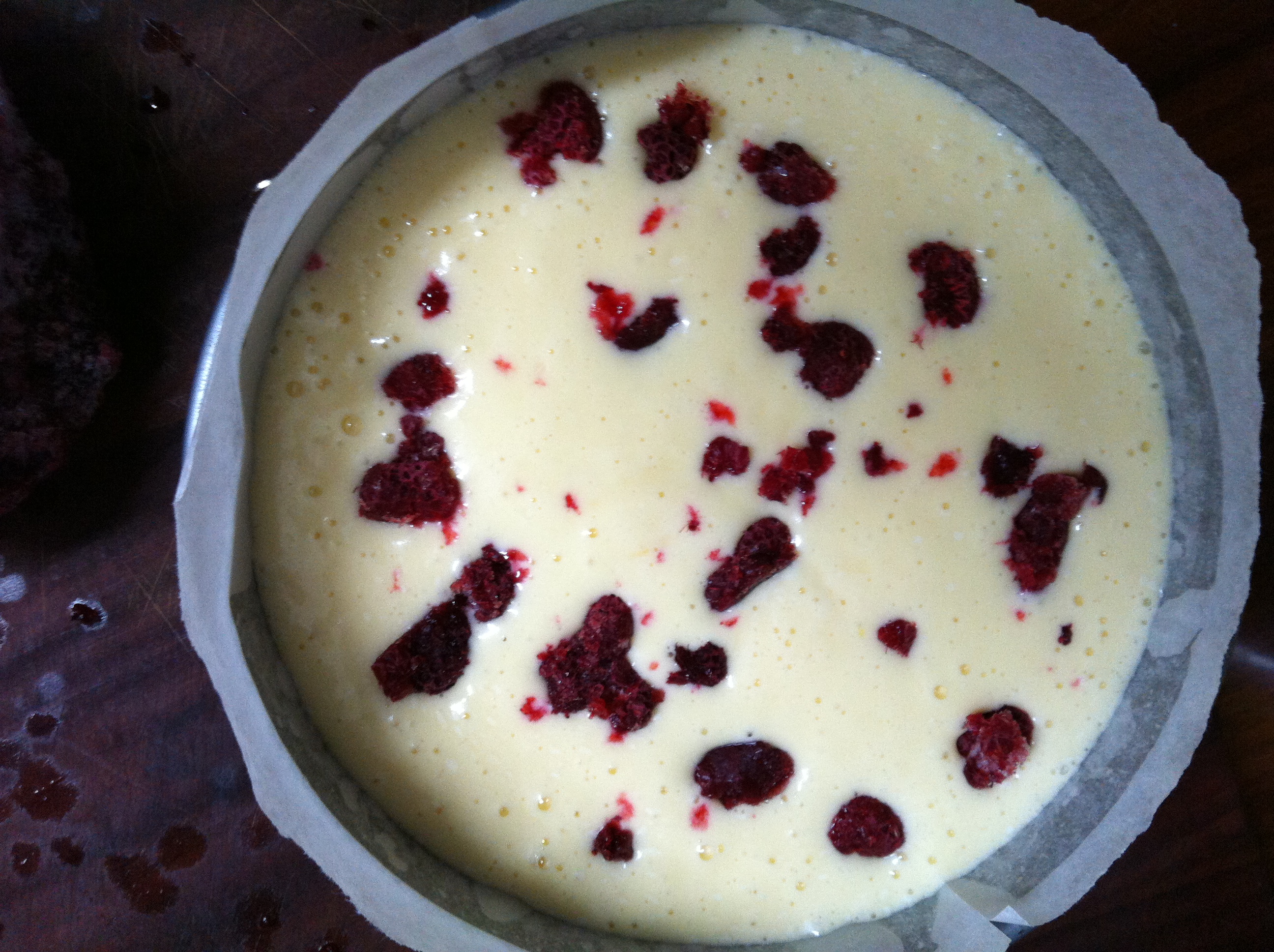 Pour the mixture into the lined tin. At this point I realised that I had not bought any fresh raspberries and only had frozen on hand, so I decided to add these on top of the batter and bake them into the cheesecake. A slight variation, but one that worked well I think.
