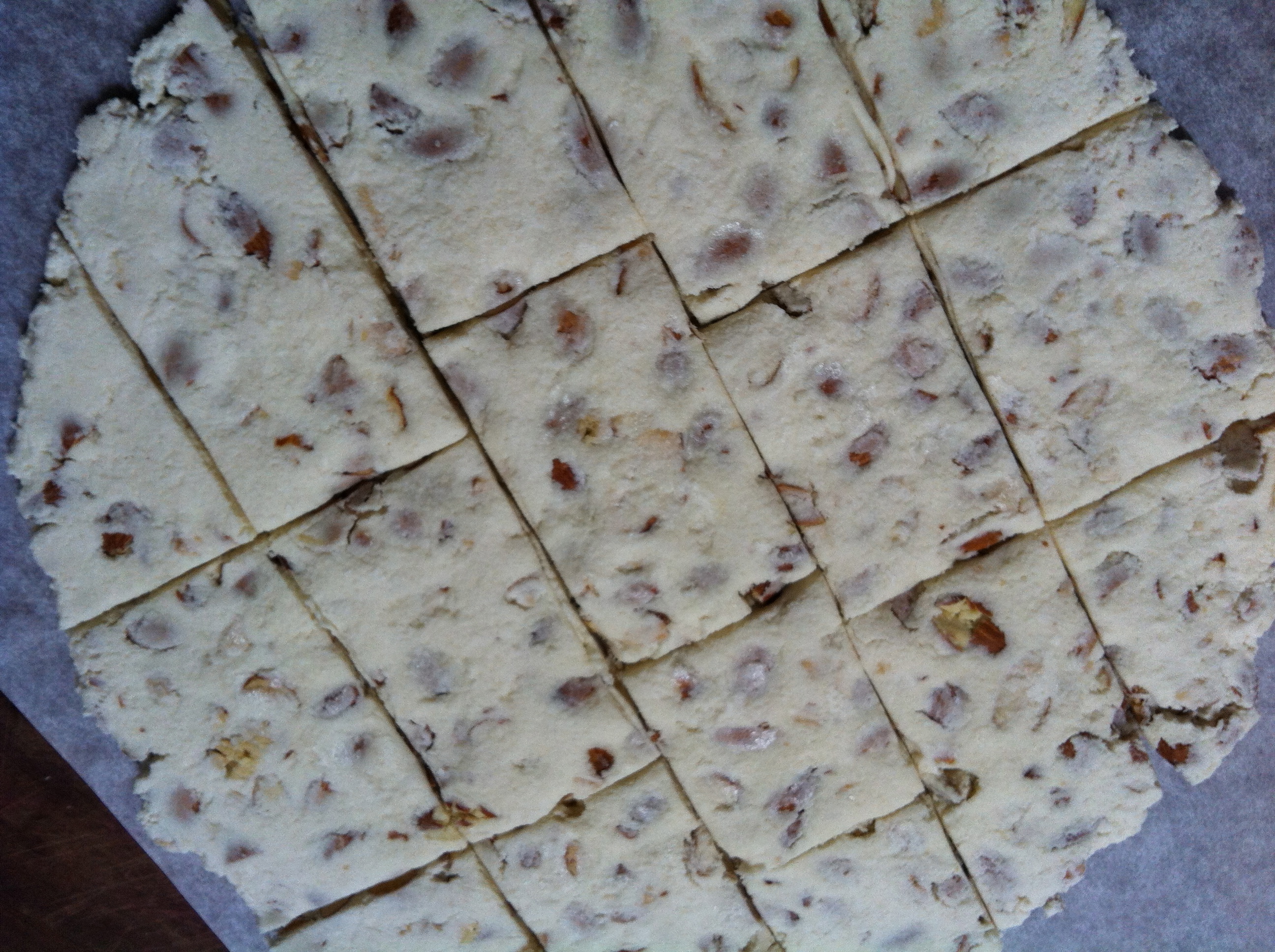 Take it out of the fridge and place the chilled disc between two sheets of baking (parchment) paper. Using a rolling pin, urge the mixture out until it is about 1cm thick. Take off the top sheet of parchment and use a sharp knife to cut the dough into strips about 6-8cm wide. Then cut each strip into 2cm lengths. Dont worry too much about getting this part perfect though, it is the ramshackle homemade look that makes these little beauties so charming.