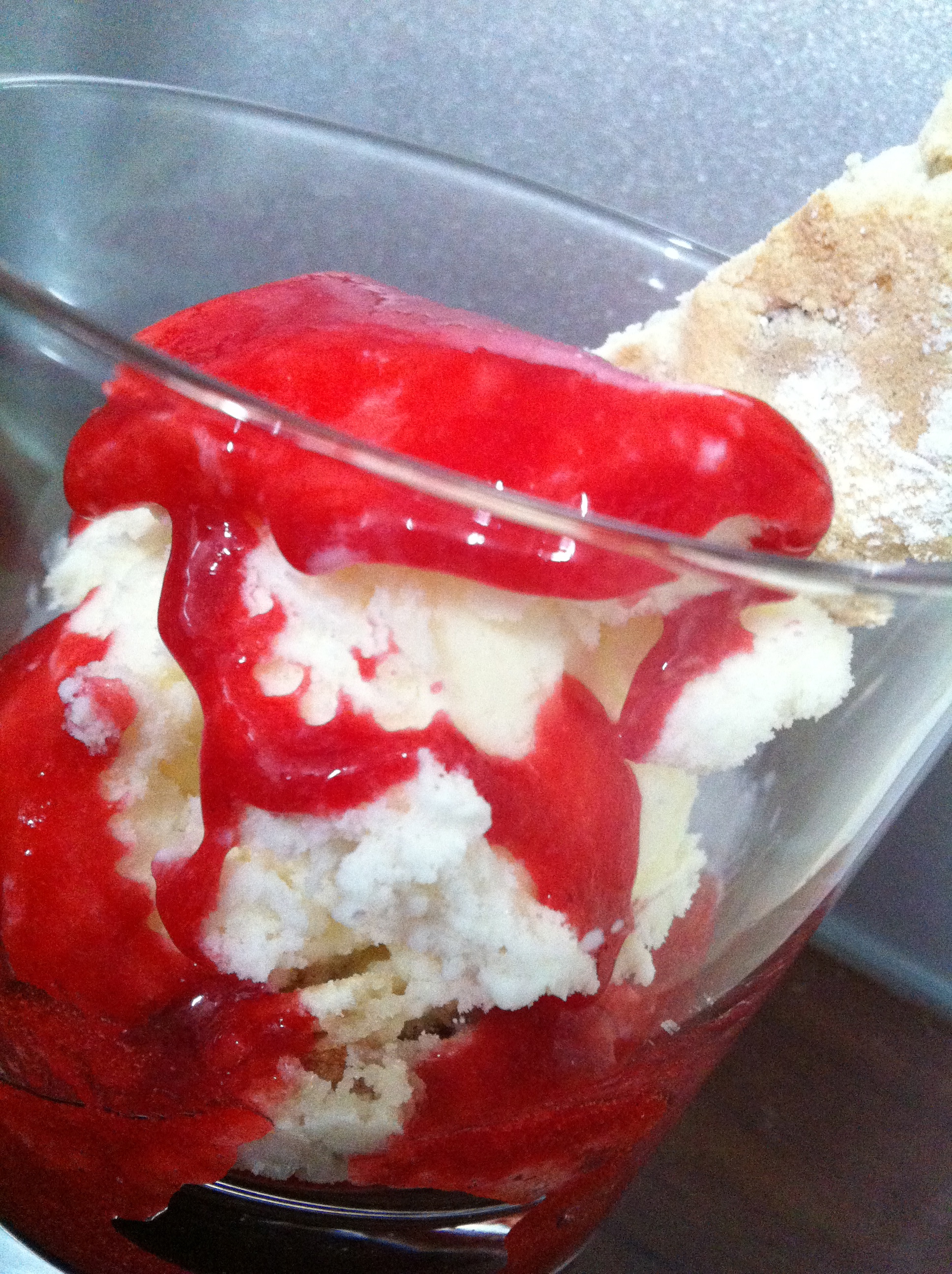 So, I was in the process of plating these up for the final photograph, when I was struck by sudden inspiration. How would these biscuits work paired with vanilla ice-cream and the left over drunken raspberry sauce from yesterday’s Cherry Fruit Salad recipe?