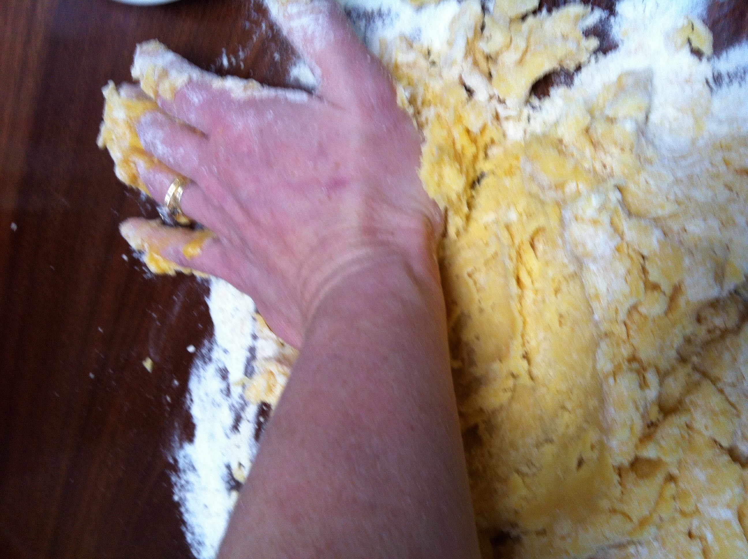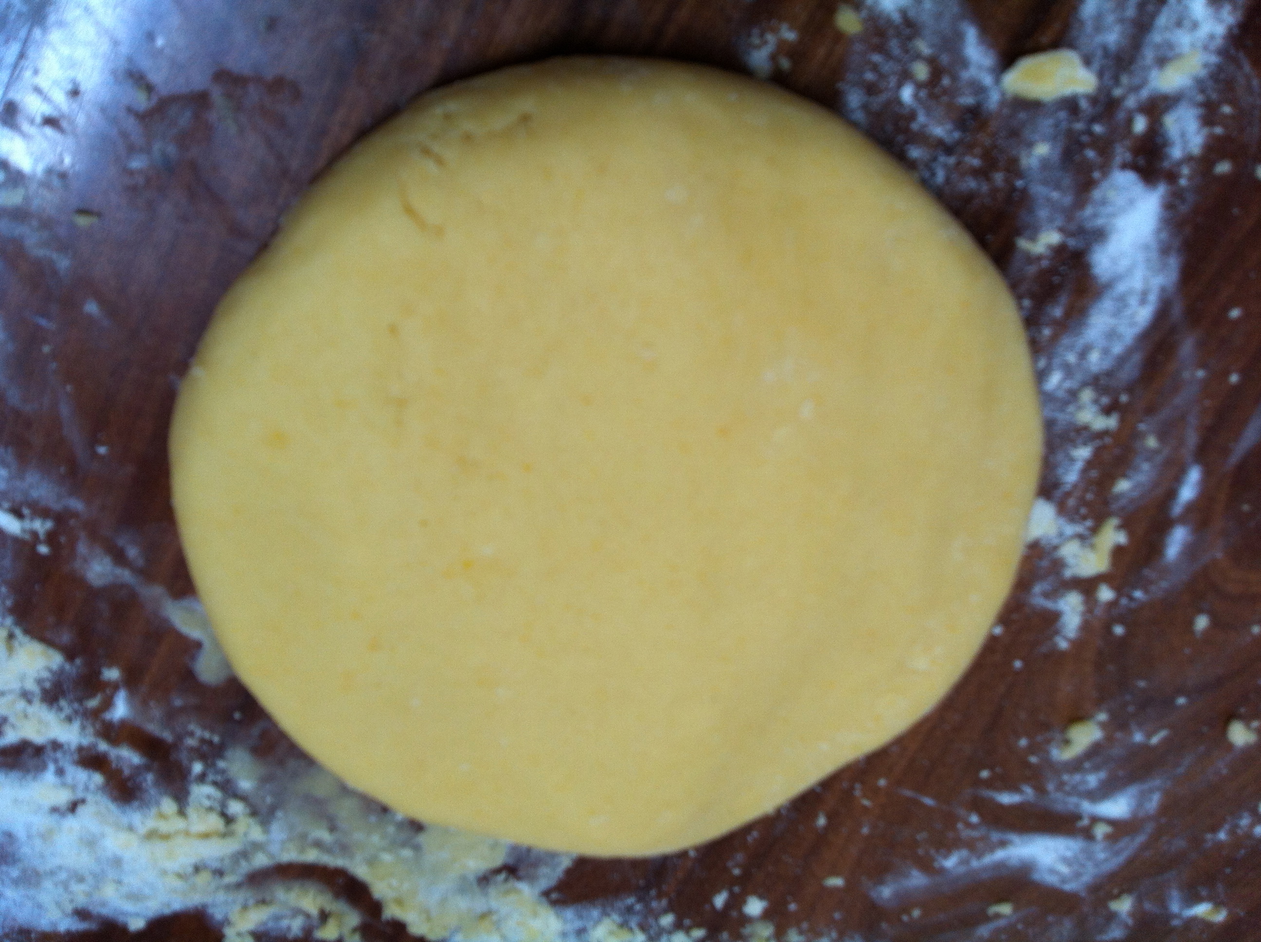 When the sugar and egg mix is thoroughly blended, add in a few drops of vanilla (if not using vanillin sugar) and lightly blend with your fingers.  Add the chopped butter to the egg mix and push it down with your fingers to soften slightly and blend with the egg.  Use your fingers to swirl and push the mixture around, incorporating the flour bit by bit as you go (sorry I don’t have photos for this part – very messy hands!).