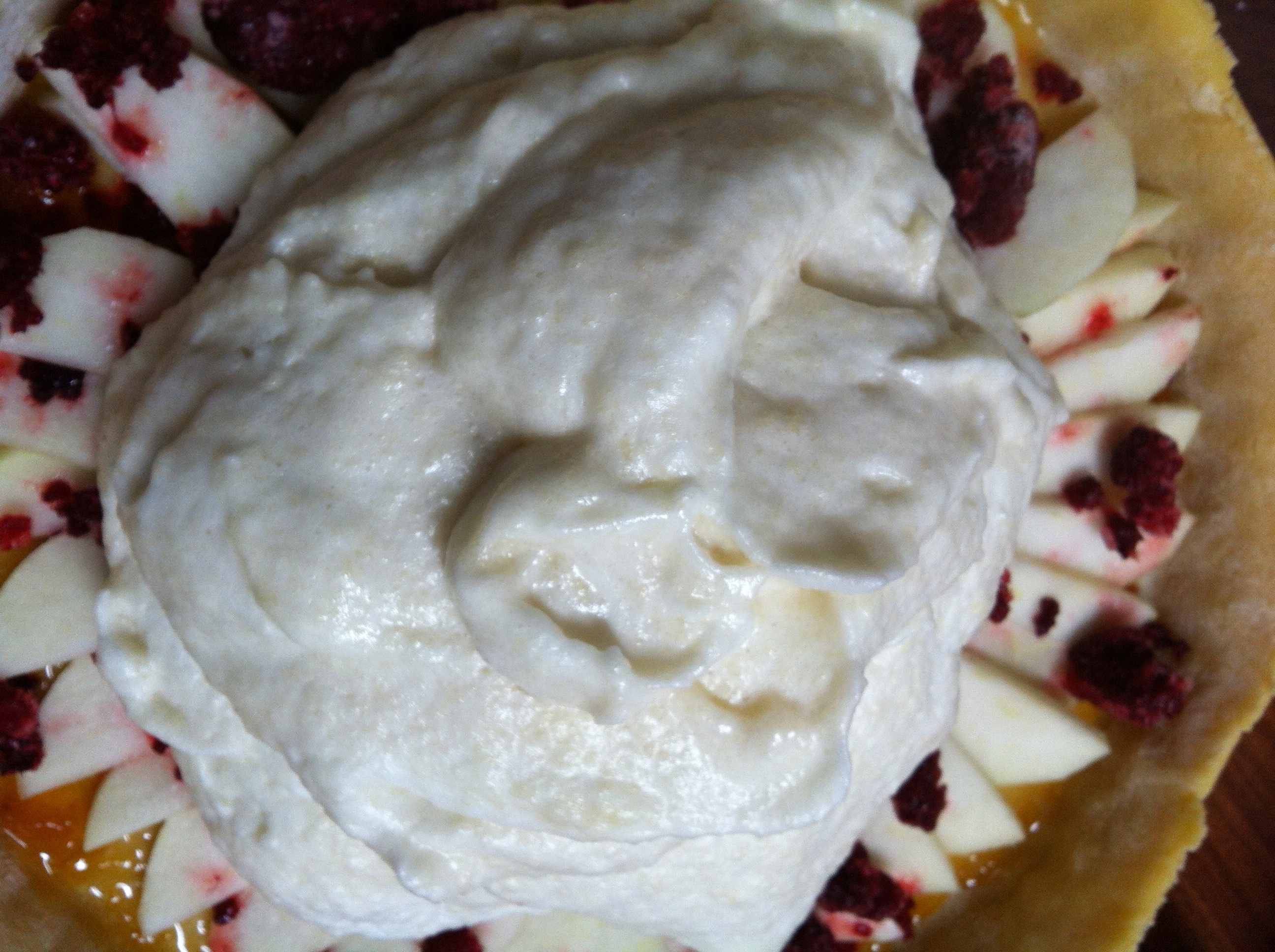 Gently spread the merengue mixture over the top of the fruit, until it stops just short of the pastry edges to allow for some expansion of the merengue mixture when cooking  (you really only need a little bit of room).