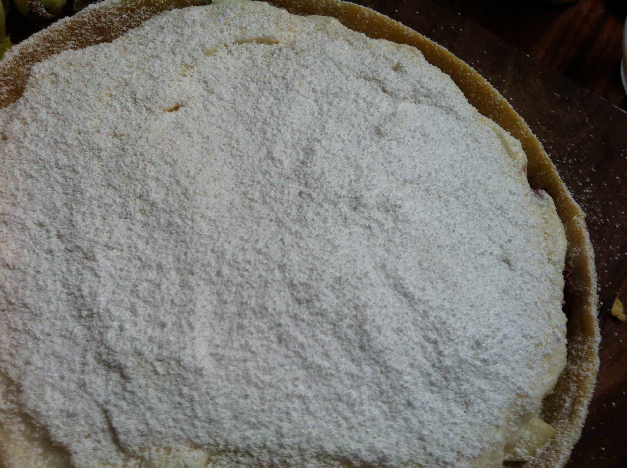 Sift over the icing sugar before baking in the oven for 30 minutes.  The idea is that the icing sugar will form a crust while cooking.  I did not measure this part and went a bit overboard with my icing sugar, so I still had a little white left when my cooking time was up, but it still tasted great!