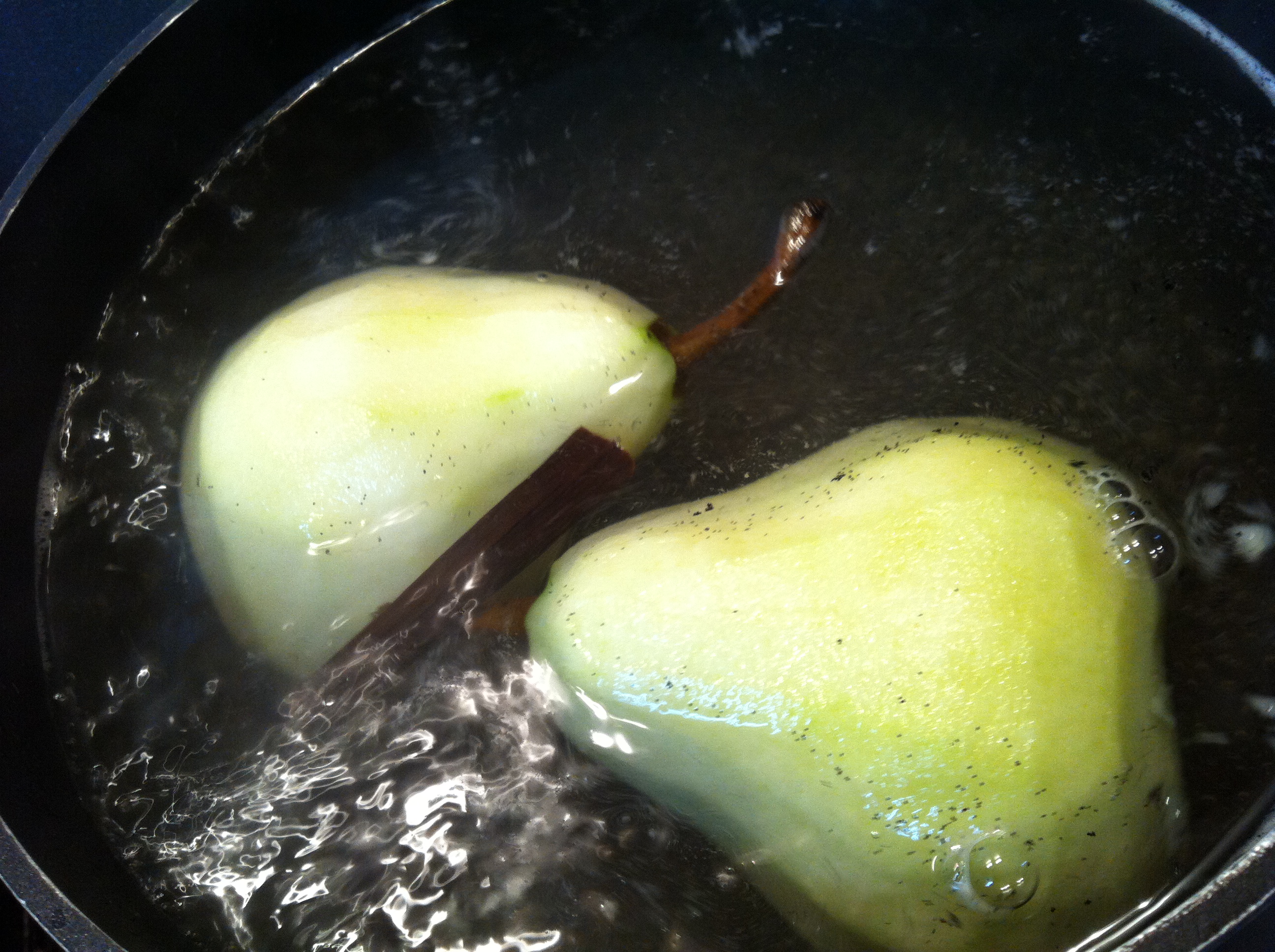 While waiting for the syrup to heat up, peel your pears and remove the cores and seeds through the base using a paring knife (carefully!) or a melon baller. I forgot to take a photo of this part, but if you are a visual person, you can check out a good demonstration here. When the water is boiling place the pears in the pot, turn the heat down and simmer covered for 15 – 20 minutes or until pears are tender (you may need to turn them over or around half way through cooking to ensure they are cooking evenly). When cooked, allow the pears to cool slightly in the syrup before serving.