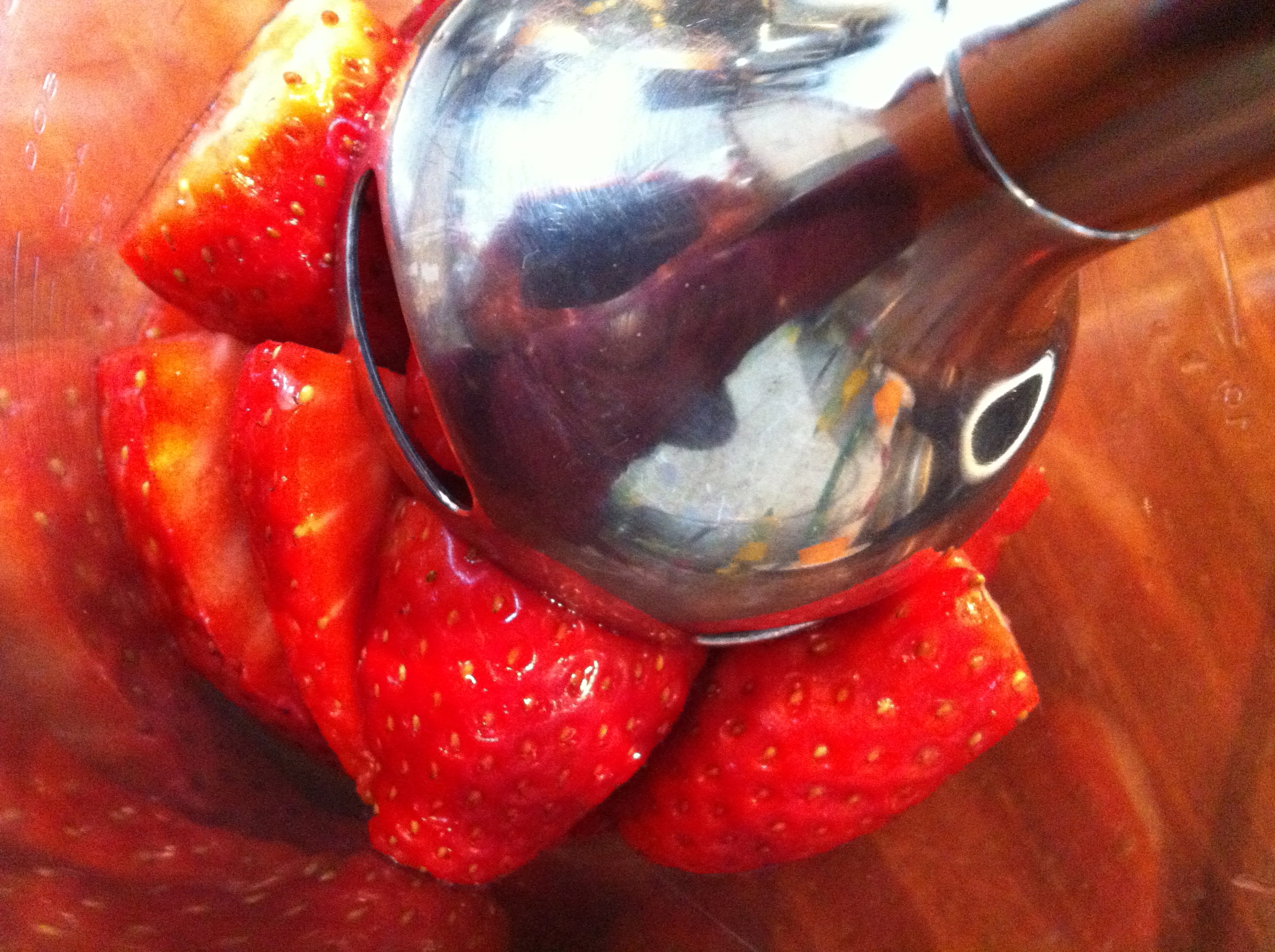 Meanwhile you can start preparing the sauce. Firstly, whip the cream with the remaining 50g of caster sugar. Then puree your strawberries using a stick mixer, and mix in the sparkling Vouvray (I used Brown Brothers Chenin Bianco created from the white grape varietal originally from the Loire Valley region of France) before gently folding in the whipped cream. Refrigerate this sauce until your pears are ready.
