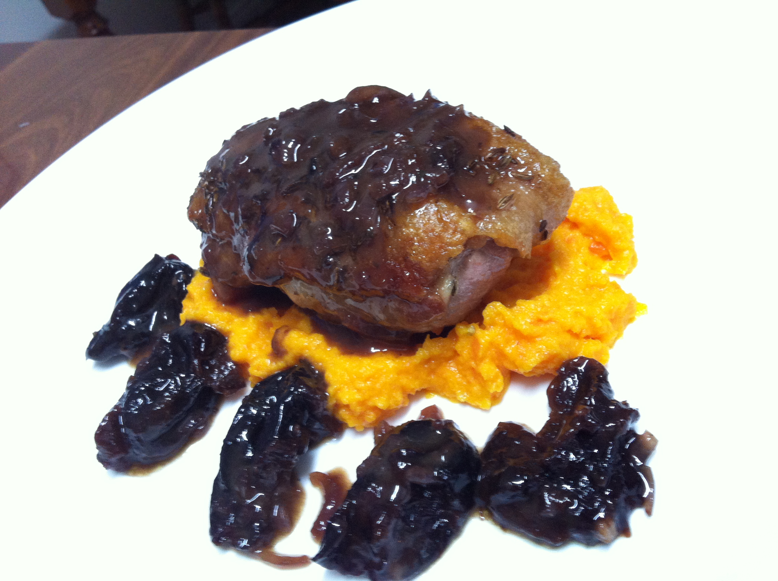 Now stir the remaining butter into the sauce, add the duck breasts back to the skillet and baste them in the sauce. Share the carrot puree between two plates and place a duck breast on top of each. Spoon over some prunes and sauce and serve.