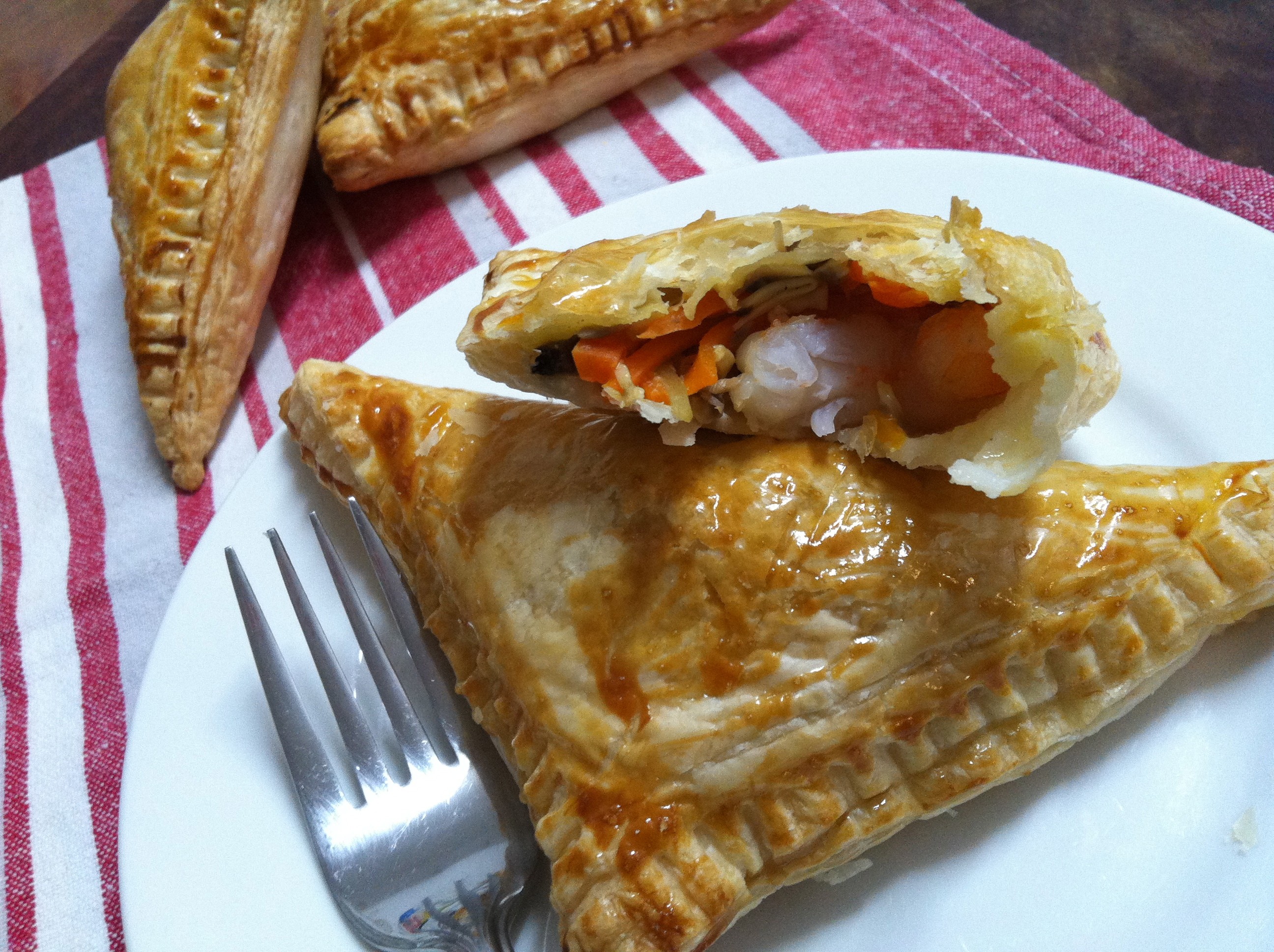 Use a sharp knife to cut your defrosted pastry sheet into four squares. Brush the edges of each square with a little egg yolk. Onto each square, place a prawn (or two depending on size) and about a tablespoon of the vegetable mix. Top this with a little of the julienned truffle and fold the pastry over to seal in a triangular shape.