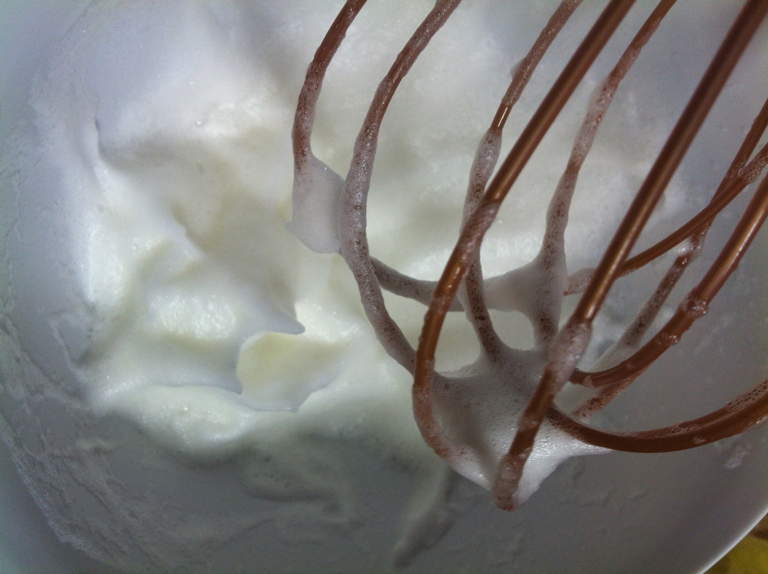 3. While the dough is beating, preheat the oven to 100 degrees celsius and then turn if off. Grease your cake tin and in a separate bowl whisk your one remaining egg white until stiff peaks form.