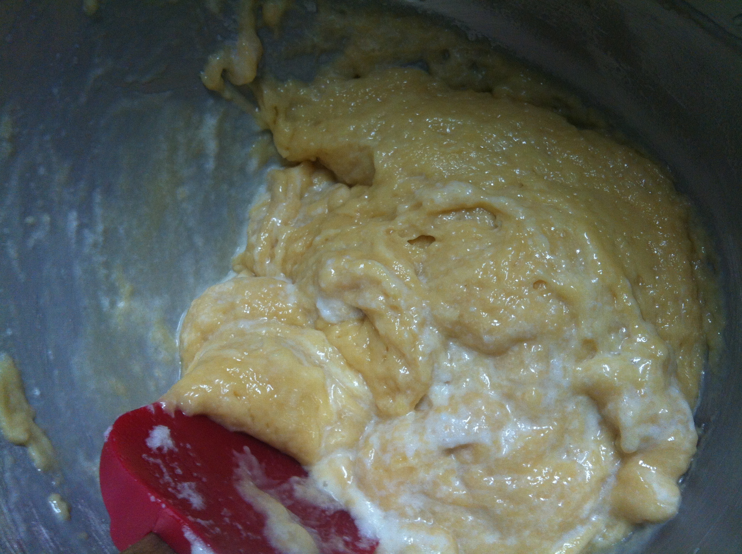 4. When the batter has come together to form a soft dough, gently fold in the beaten egg whites, and put the dough into the cake tin. I used a standard kugelhopf mould for mine – battu moulds being hard (impossible) to come by in Melbourne!
