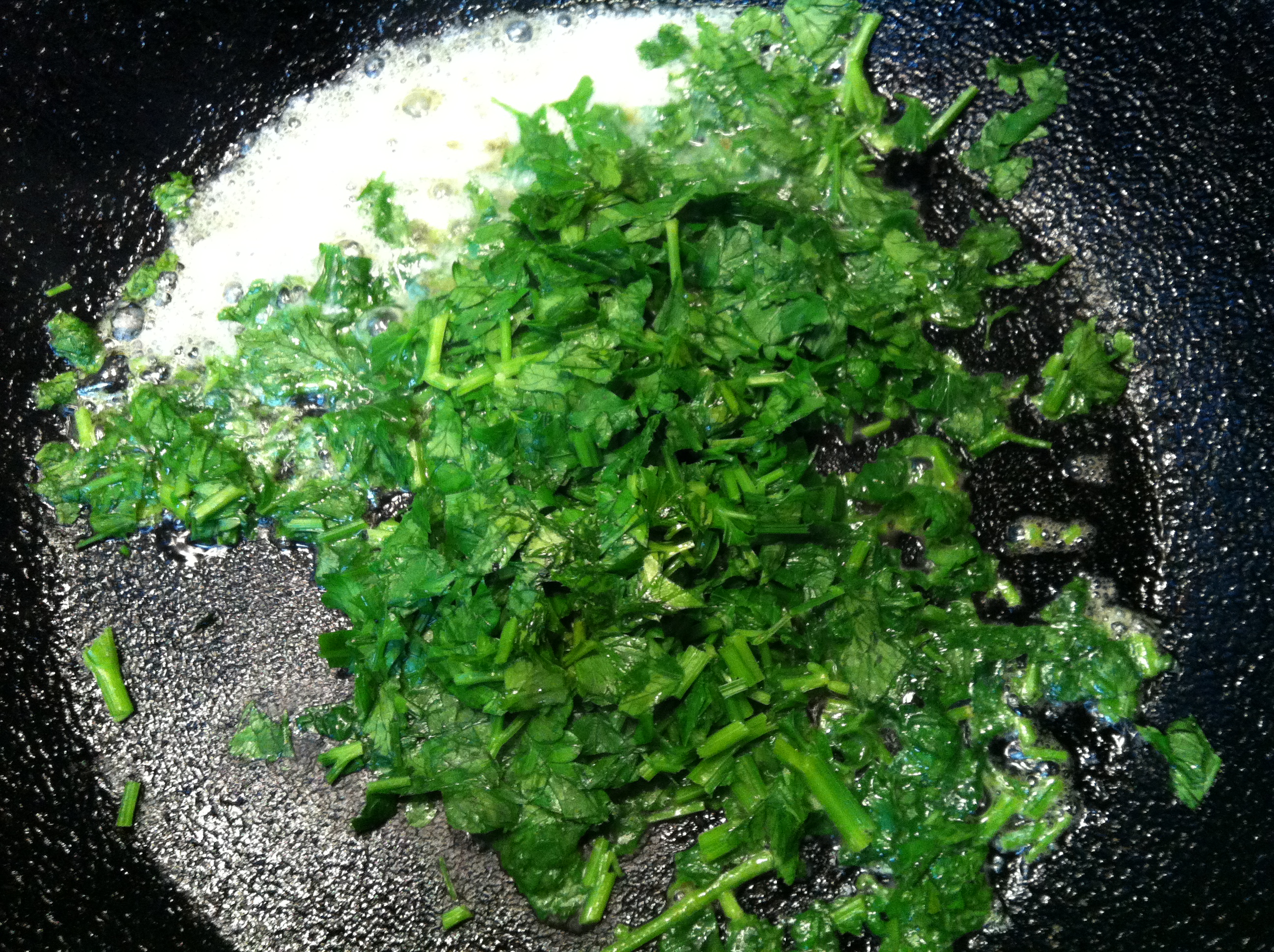 While the dough is mixing, chop the parsley roughly (you’ll be blending the mix later, so no point fussing with it) and fry it off in a pan with the butter over a medium heat.