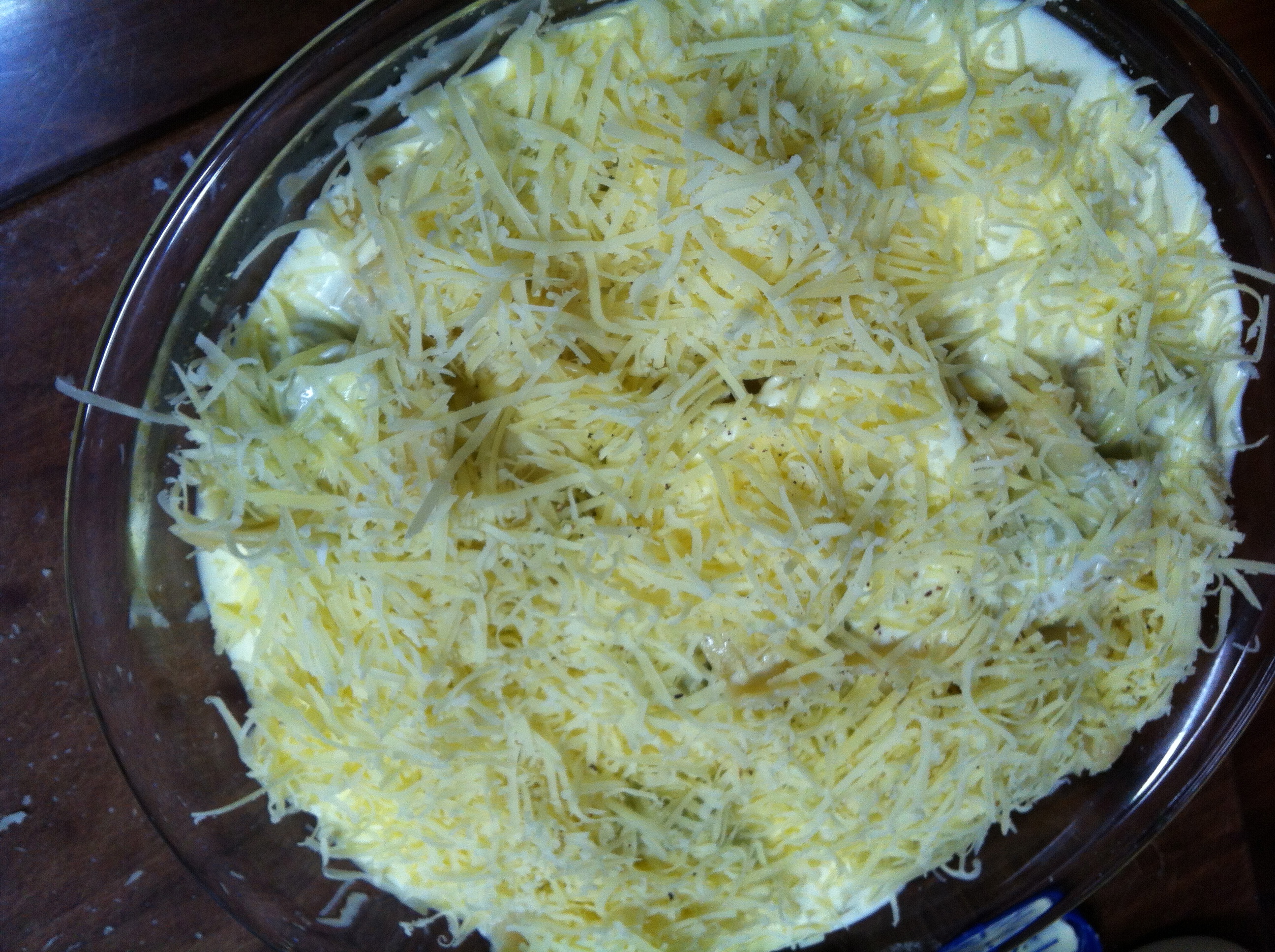 When cooked, strain and transfer to a baking dish. Drizzle generously with cream, season with salt and pepper and sprinkle generously with gruyere. I’ve not listed amounts, just do it your liking.
