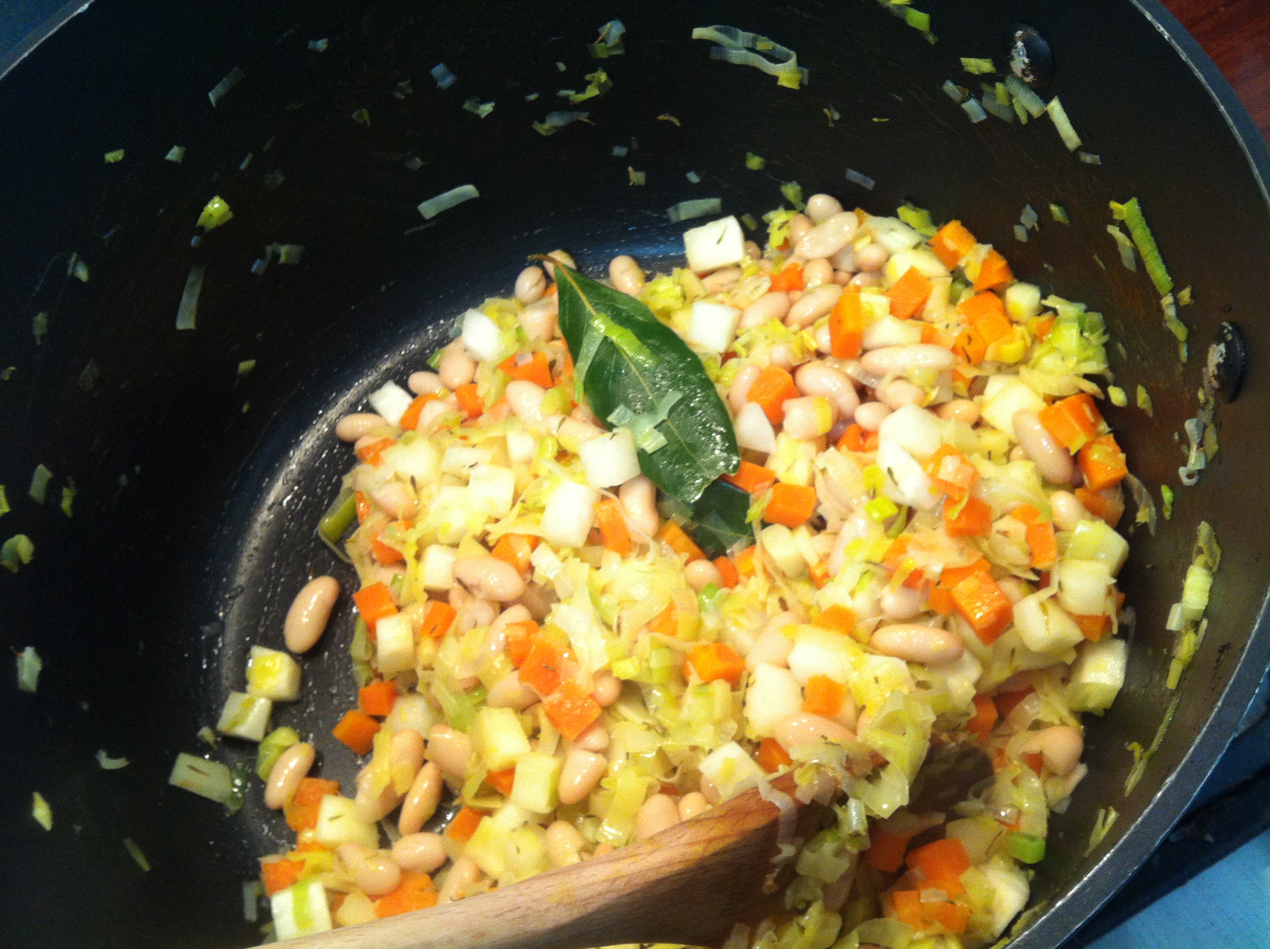 Add a little olive oil to a large stock pot and add the sliced leek, garlic, bay leaves, beans and diced carrot, turnip and parsnip. Sweat these over a medium heat to extract maximum flavour for your soup.