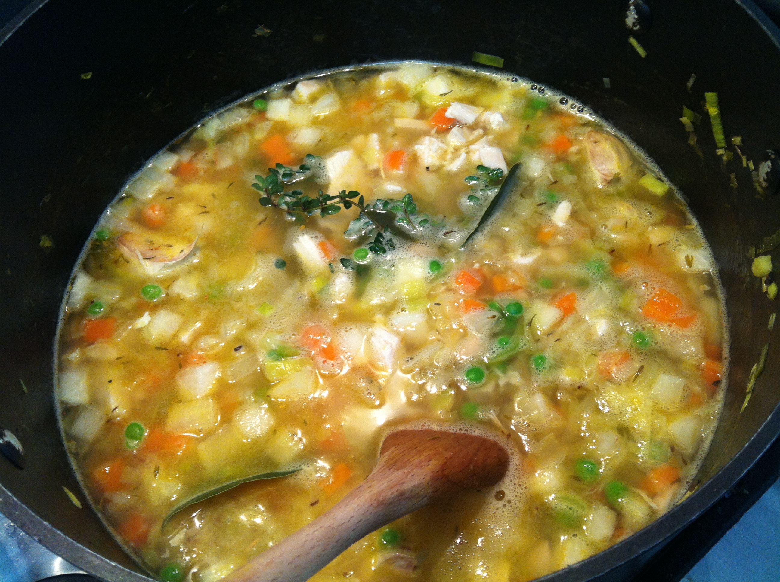 When the vegetables are softened, add the chicken if you are using it and the stock before topping up with water as needed. Season well with salt and pepper and cover to simmer until the vegetables are cooked.