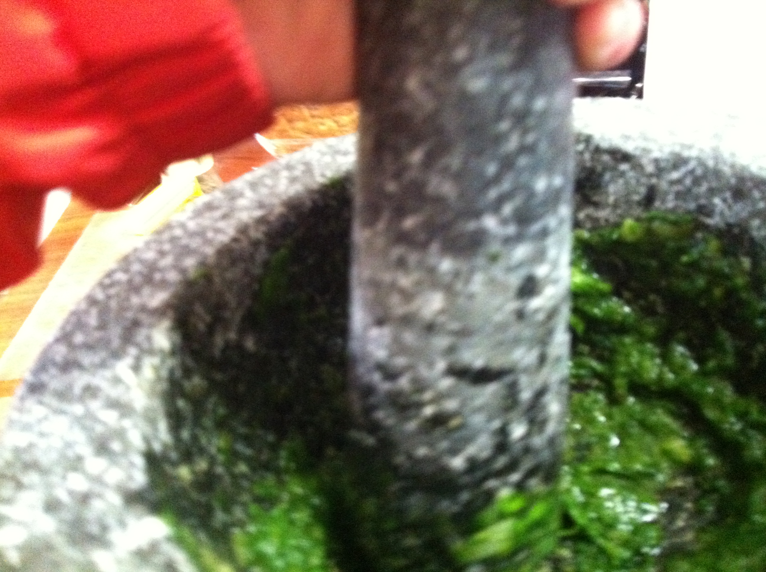 While the soup is cooking, make you pistou. You can use a blender or a mortar and pestle depending on what is easiest for you. Start by pulverising the garlic with a decent pinch of salt. Then add in the torn basil leaves and pound until liquified. Add the tomato as per tradition, along with the cheese and oil and pound until a thickish paste forms and the aromas are filling your senses…