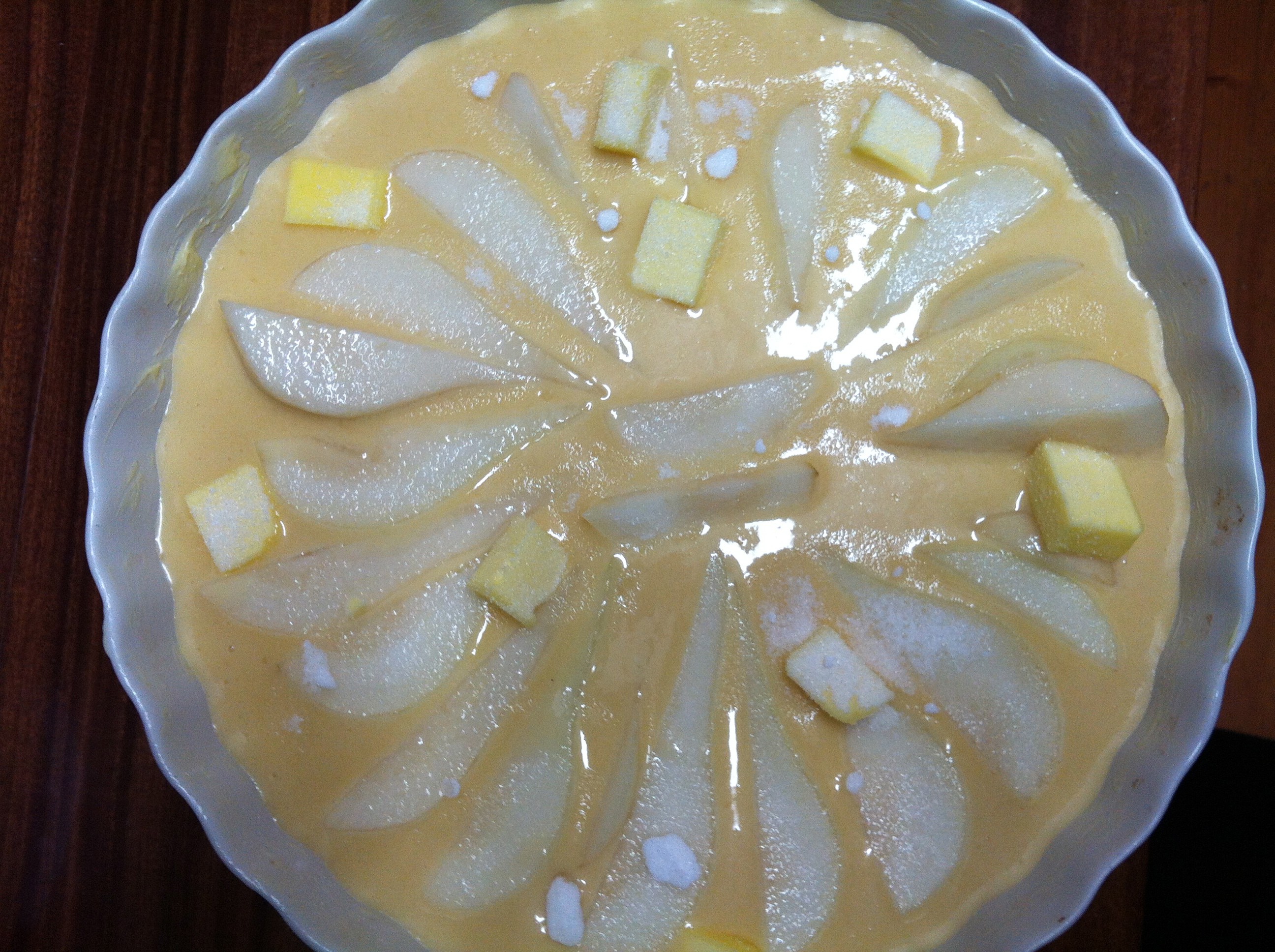 3. Grease a 23cm flan dish (or cake pan) and pour in the batter. Arrange the pear slices on top, dot with some chopped butter and a sprinkle over a little more caster sugar.