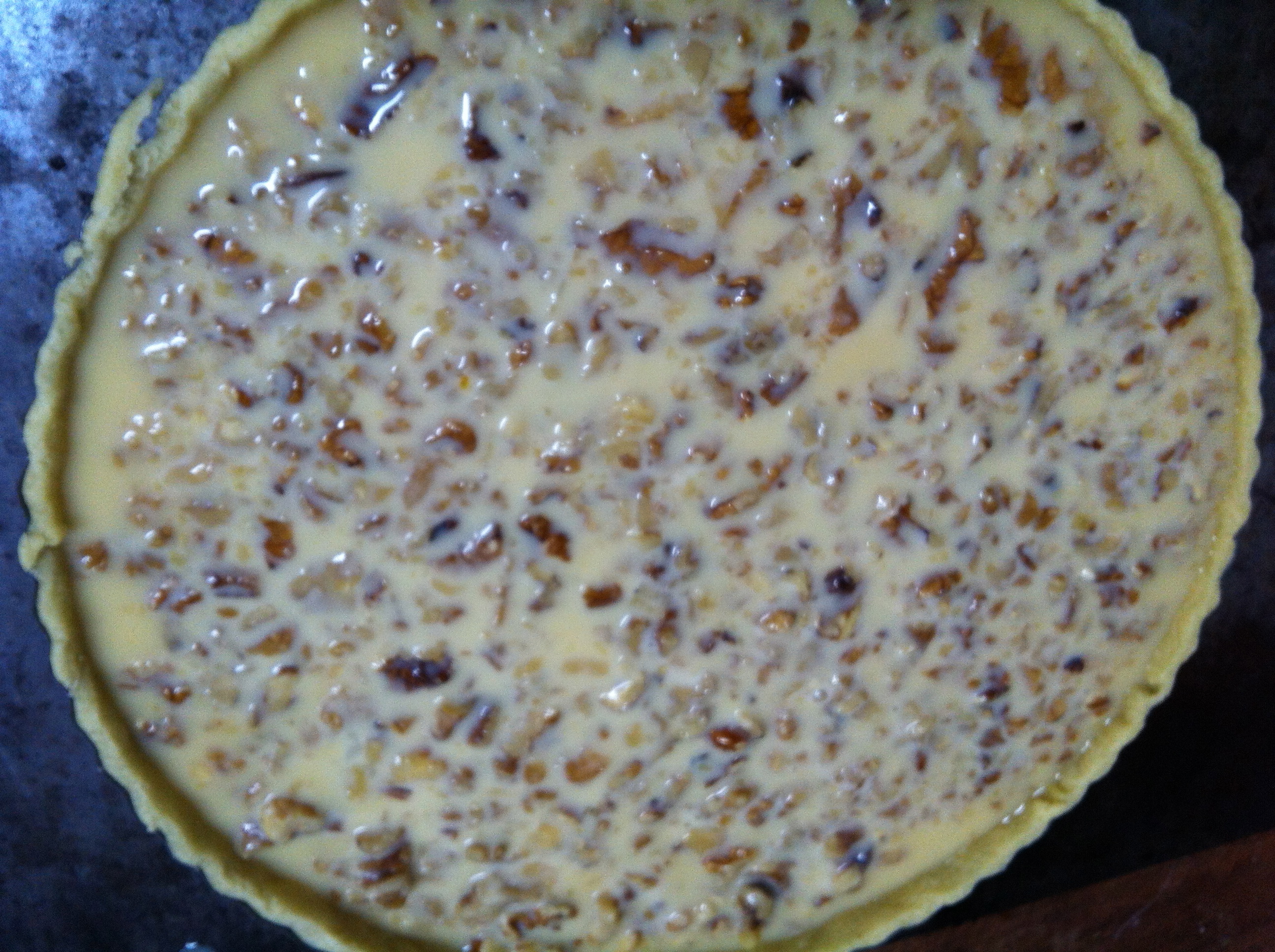 While the tart case is baking, whisk together the eggs, caster sugar, milk, cream and ground walnuts. When combined, stir through the roughly chopped walnuts and a touch of salt.
