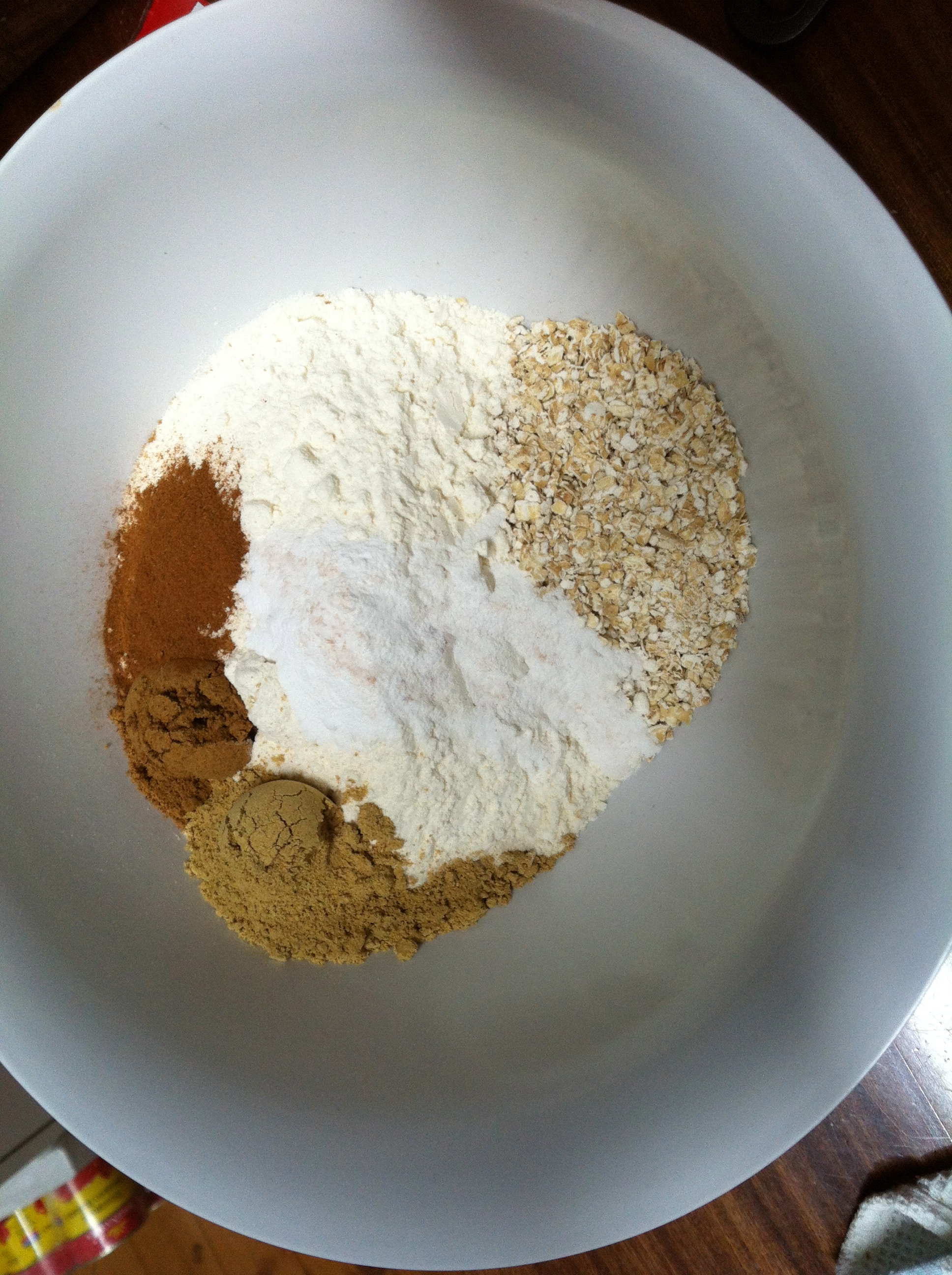 While this is happening, add your oatmeal, flour, baking powder and spices to a large mixing bowl and stir to combine. Grease an 8 inch square cake tin and line with baking paper.